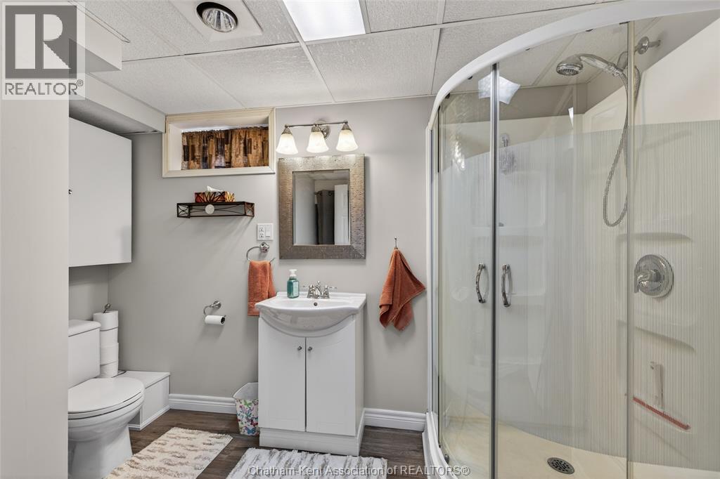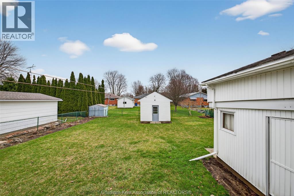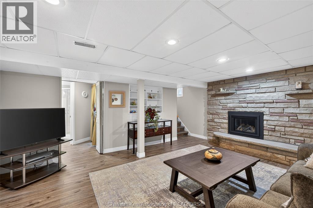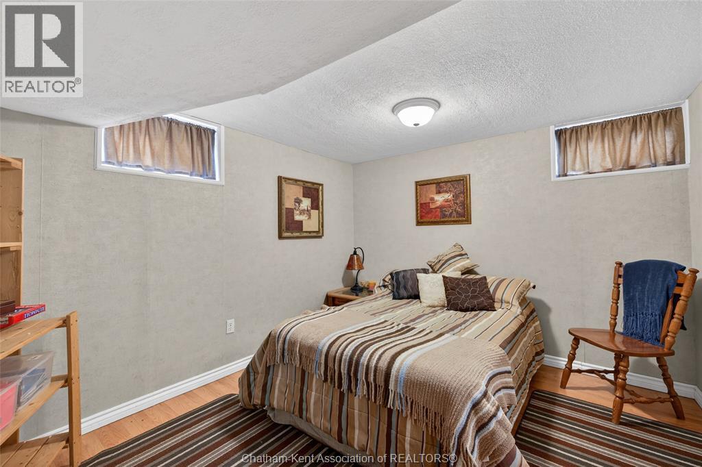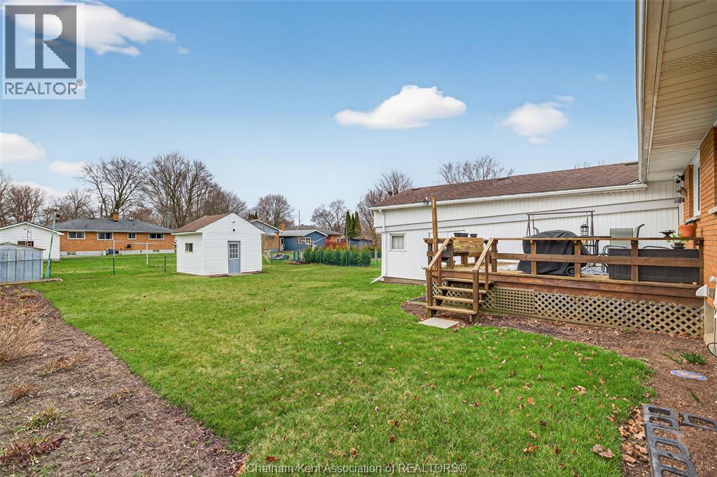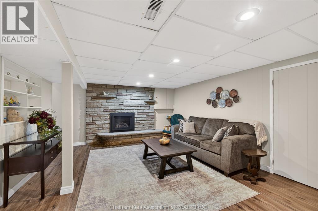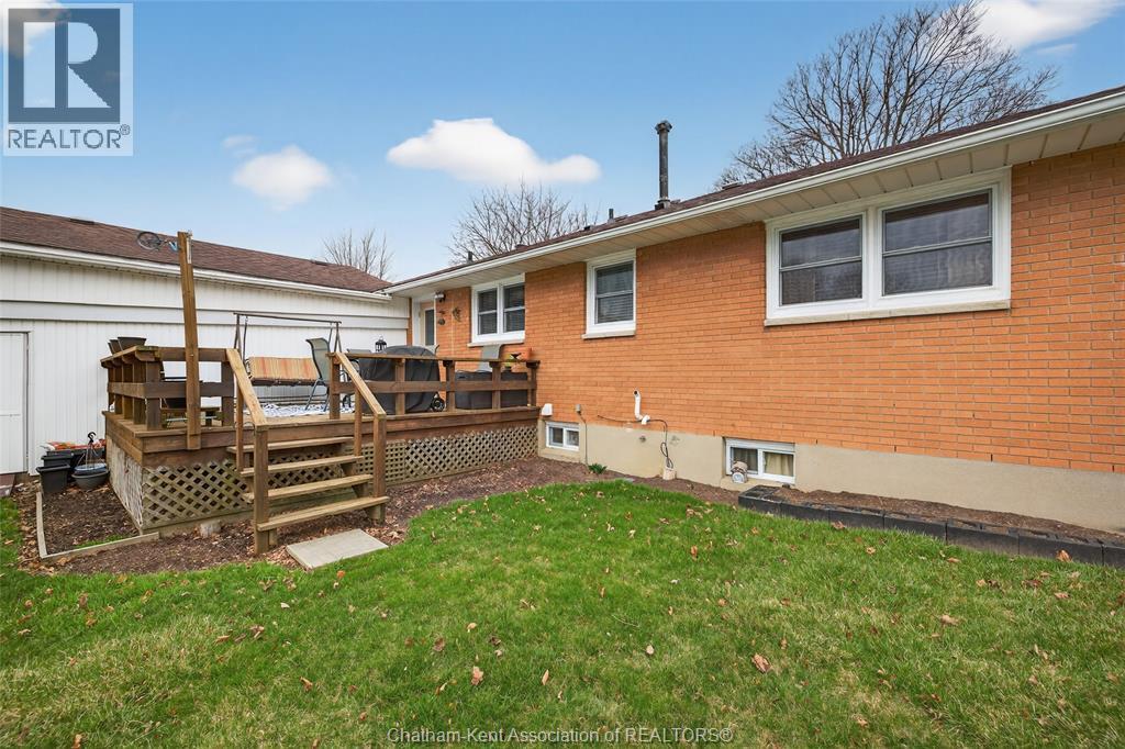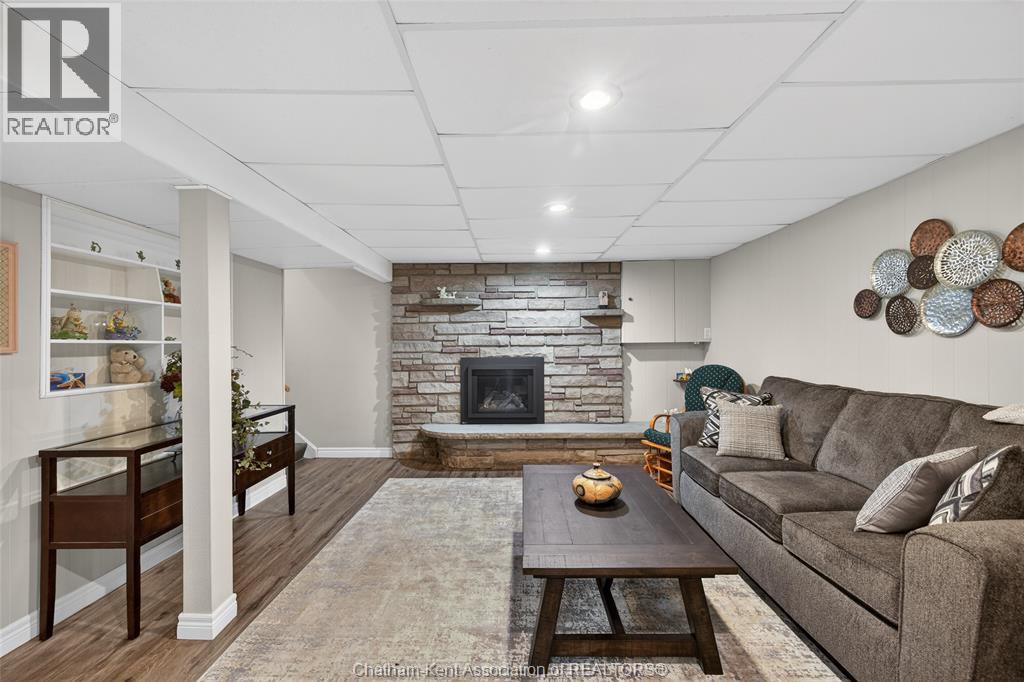 Pride of ownership shows throughout this solid brick bungalow in one of Chatham's most established neighbourhoods — 2 main floor bedrooms, hardwood floors, bright living and dining area, and an updated kitchen with painted cabinetry, centre island, pendant lighting, and mudroom entry with patio doors leading to a rear deck overlooking a beautifully maintained backyard. The main floor 4-piece bath is complemented by a fully finished lower level that genuinely impresses — large rec room with stacked-stone gas fireplace, second living area, 2 additional bedrooms, and a 3-piece bath with glass shower. Four bedrooms total with a layout that suits growing families, multi-generational living, or anyone needing extra space. The oversized attached garage offers serious storage and workspace potential, a separate storage shed adds even more utility, and the wide concrete driveway ties together an outdoor package that's as functional as it is attractive. (id:4555)