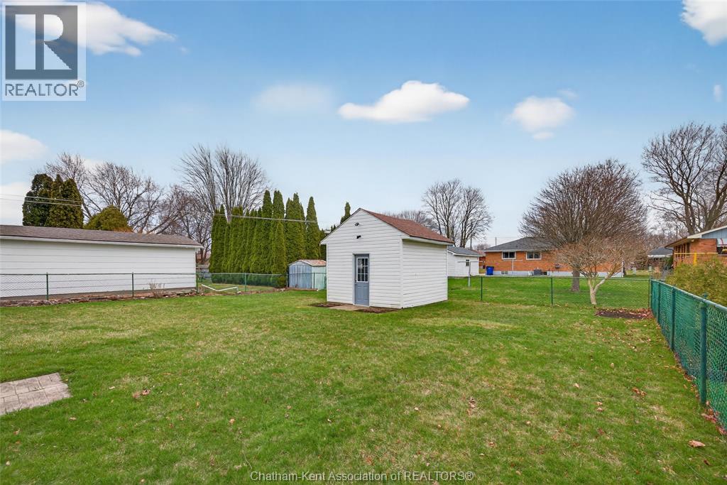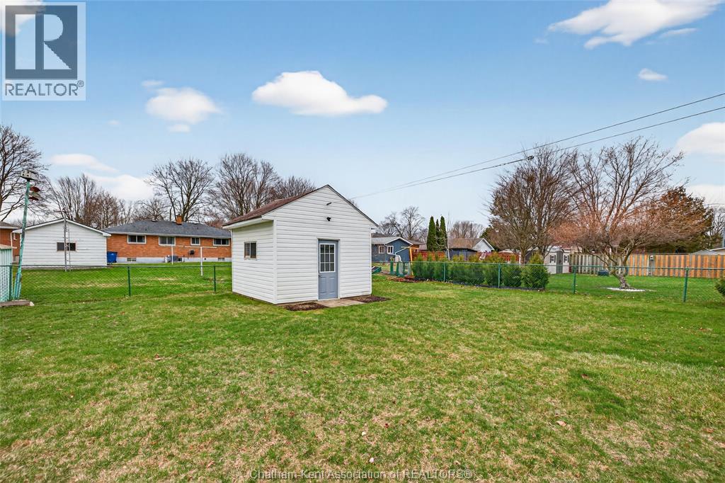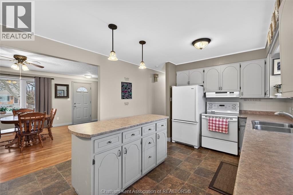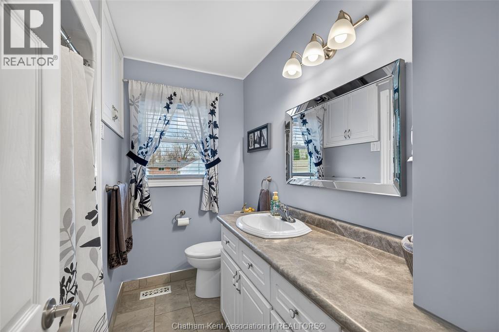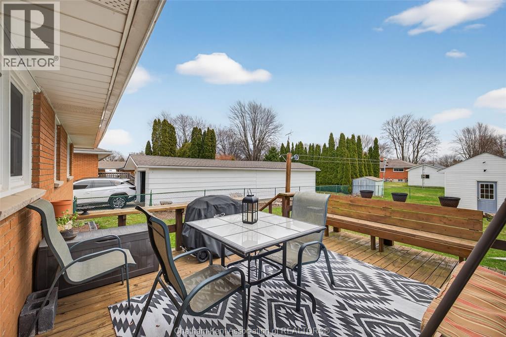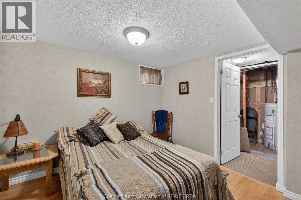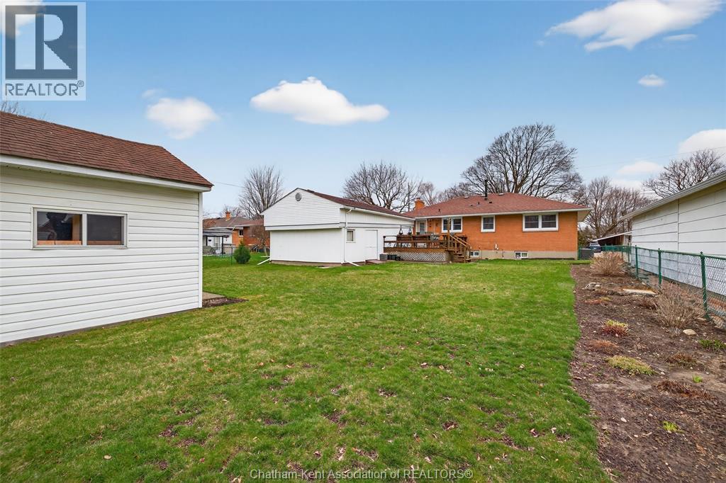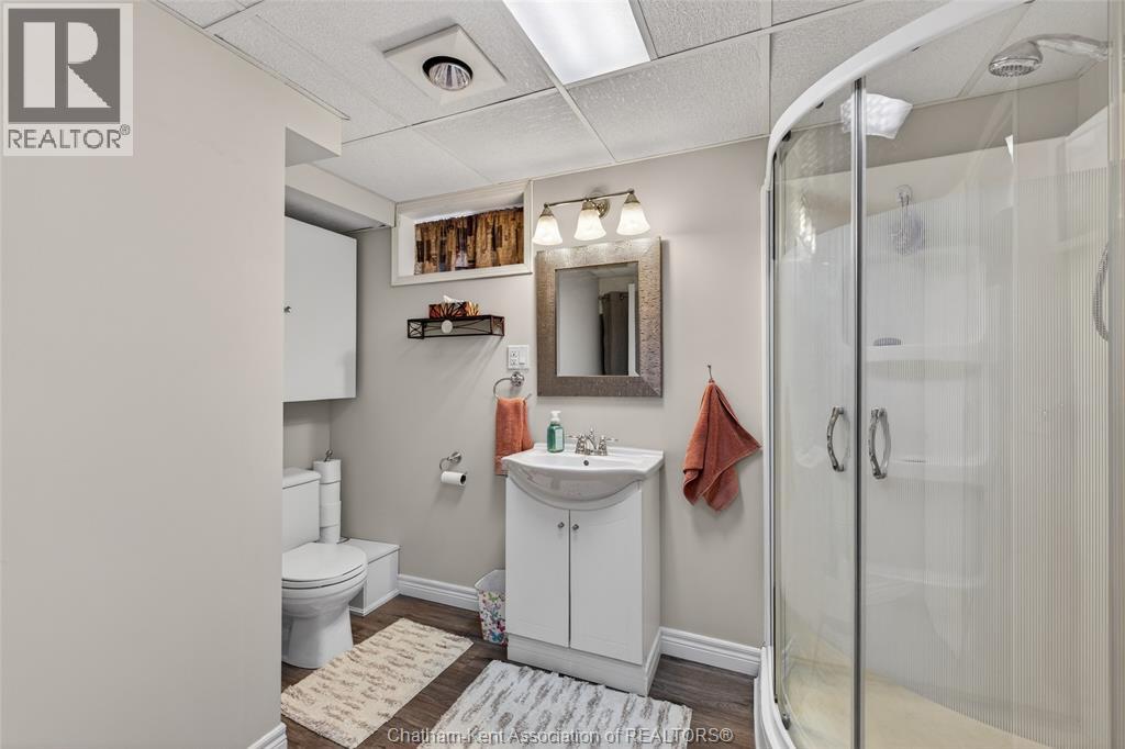 Pride of ownership shows throughout this solid brick bungalow in one of Chatham's most established neighbourhoods — 2 main floor bedrooms, hardwood floors, bright living and dining area, and an updated kitchen with painted cabinetry, centre island, pendant lighting, and mudroom entry with patio doors leading to a rear deck overlooking a beautifully maintained backyard. The main floor 4-piece bath is complemented by a fully finished lower level that genuinely impresses — large rec room with stacked-stone gas fireplace, second living area, 2 additional bedrooms, and a 3-piece bath with glass shower. Four bedrooms total with a layout that suits growing families, multi-generational living, or anyone needing extra space. The oversized attached garage offers serious storage and workspace potential, a separate storage shed adds even more utility, and the wide concrete driveway ties together an outdoor package that's as functional as it is attractive. (id:4555)