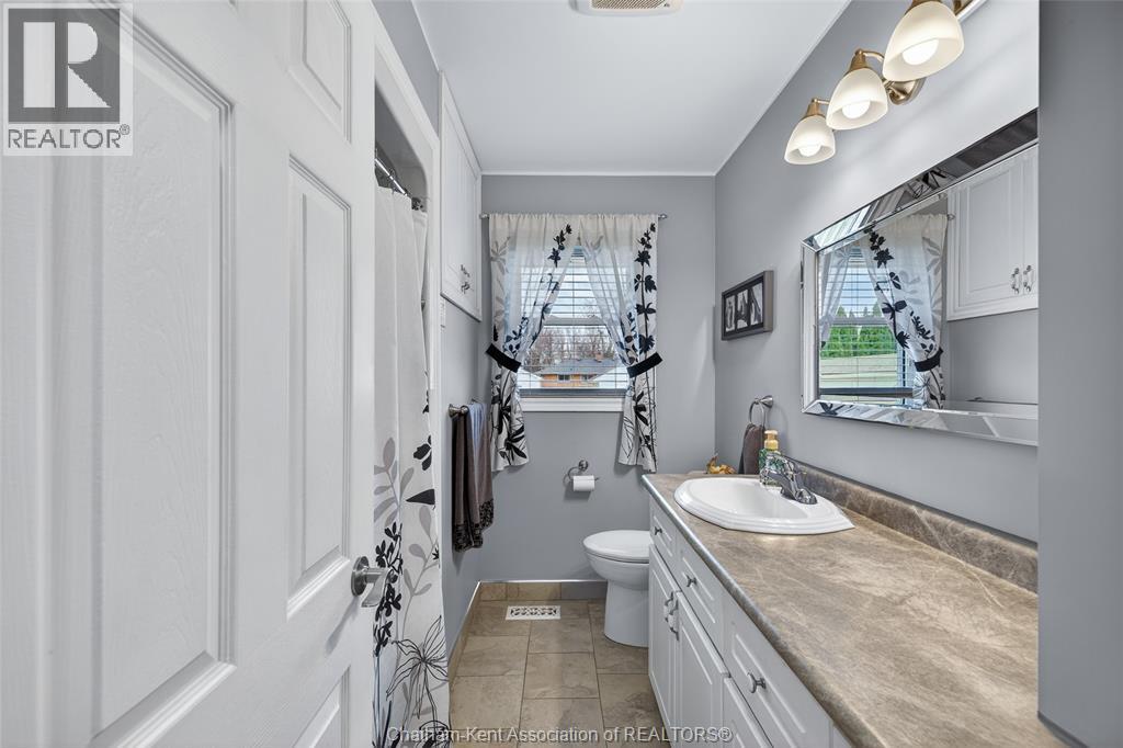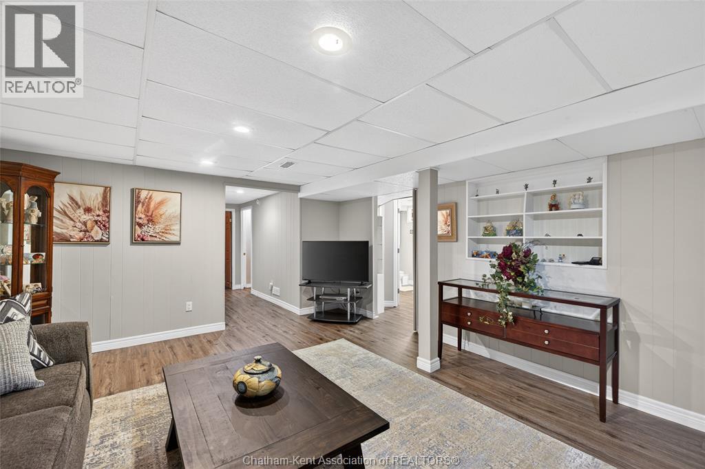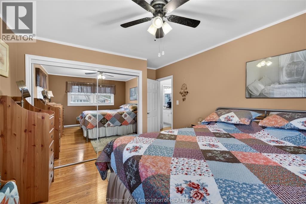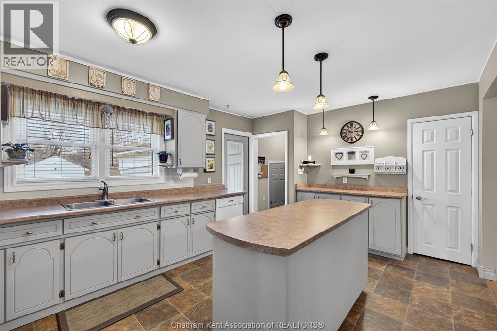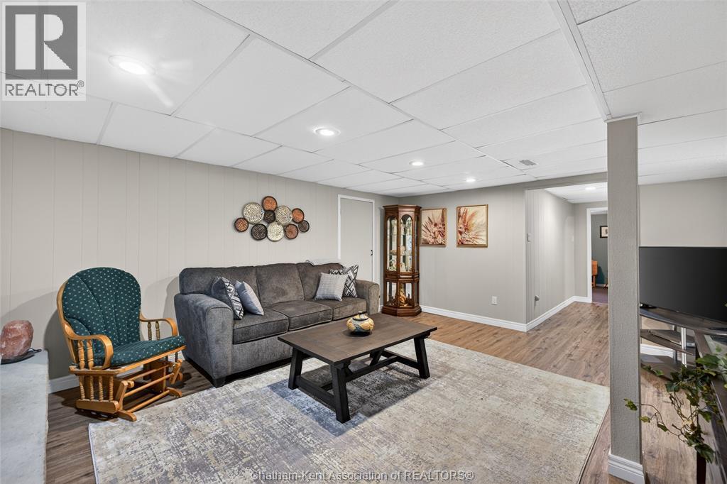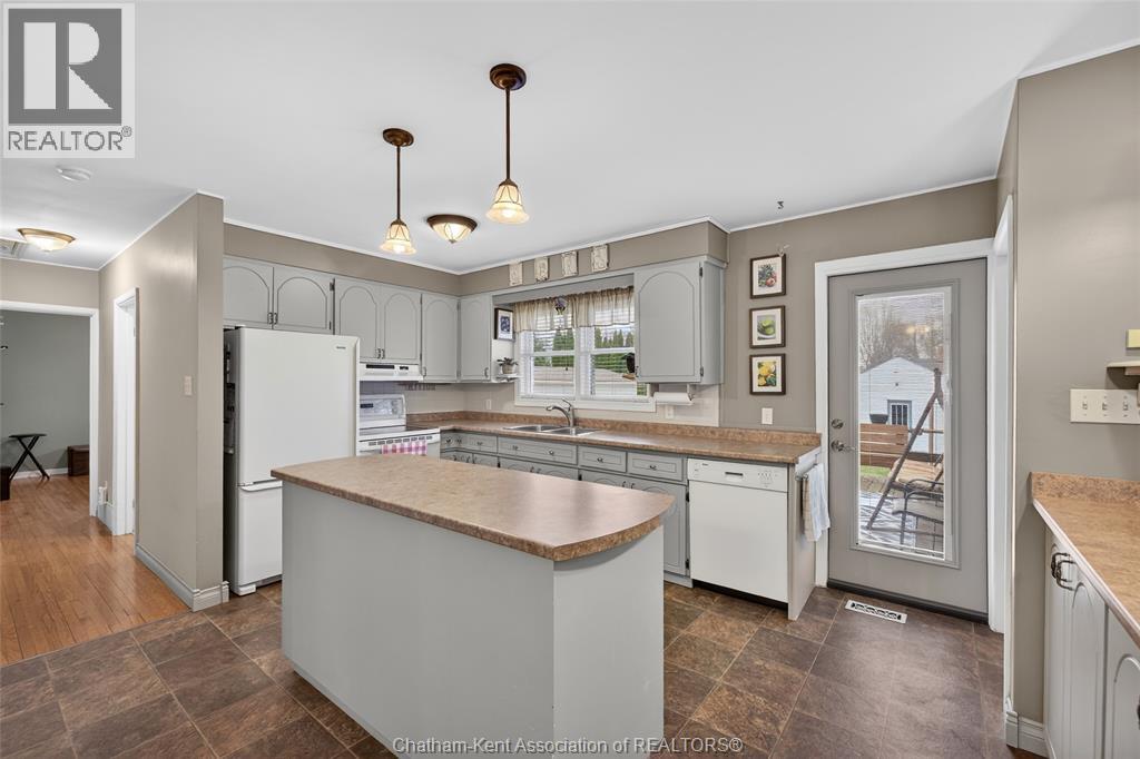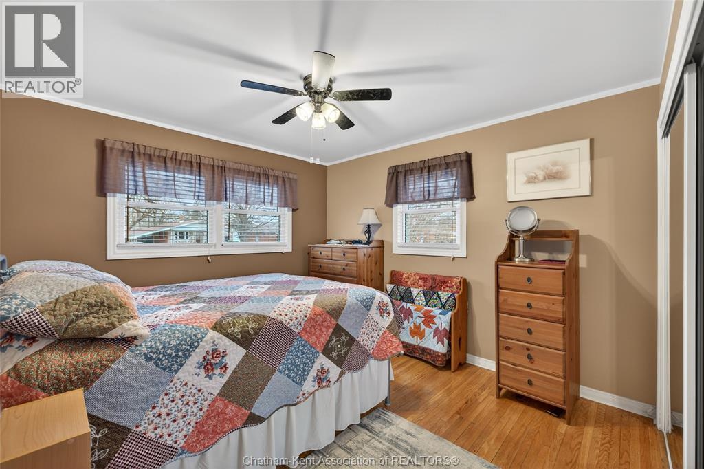 Pride of ownership shows throughout this solid brick bungalow in one of Chatham's most established neighbourhoods — 2 main floor bedrooms, hardwood floors, bright living and dining area, and an updated kitchen with painted cabinetry, centre island, pendant lighting, and mudroom entry with patio doors leading to a rear deck overlooking a beautifully maintained backyard. The main floor 4-piece bath is complemented by a fully finished lower level that genuinely impresses — large rec room with stacked-stone gas fireplace, second living area, 2 additional bedrooms, and a 3-piece bath with glass shower. Four bedrooms total with a layout that suits growing families, multi-generational living, or anyone needing extra space. The oversized attached garage offers serious storage and workspace potential, a separate storage shed adds even more utility, and the wide concrete driveway ties together an outdoor package that's as functional as it is attractive. (id:4555)