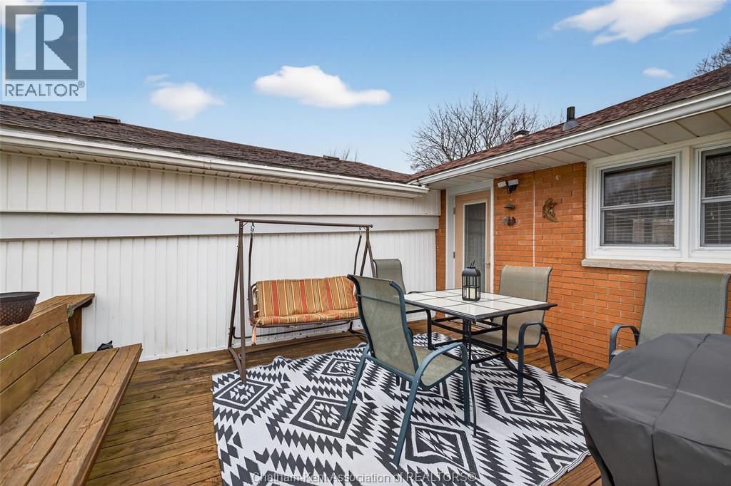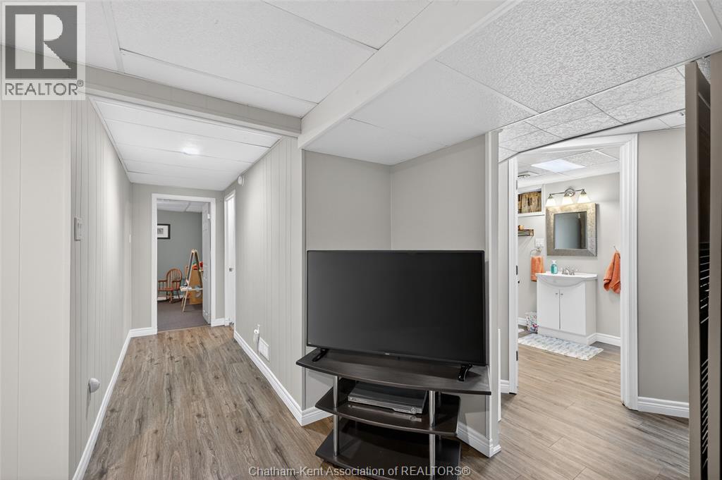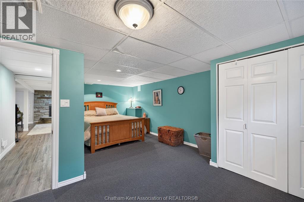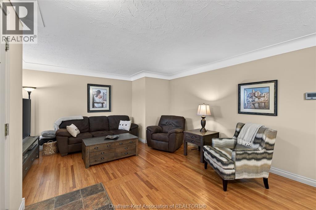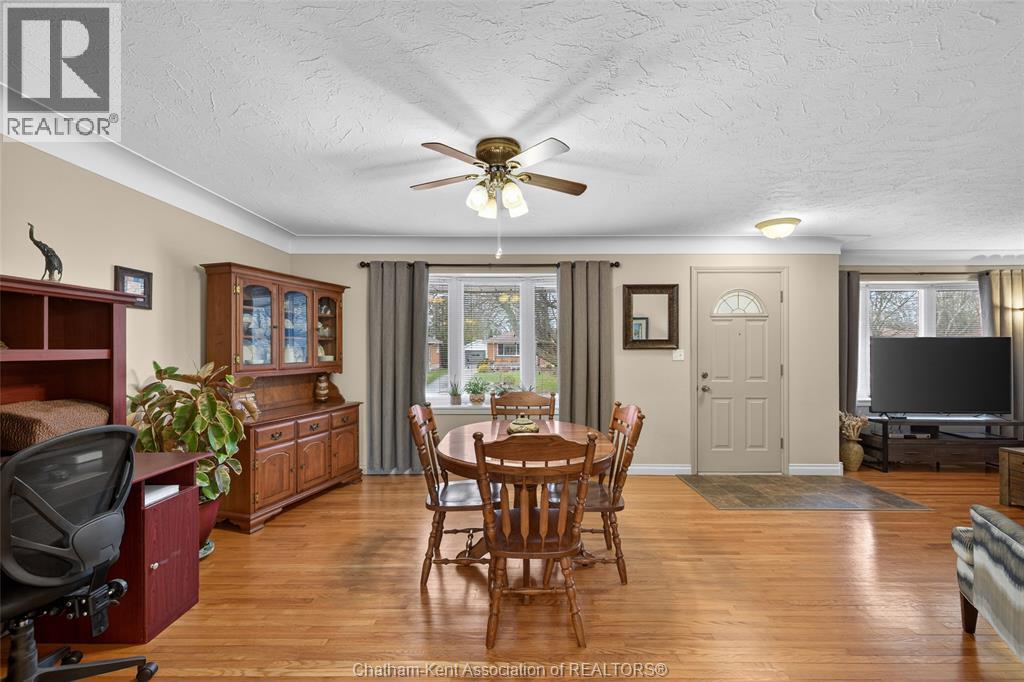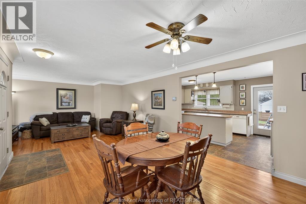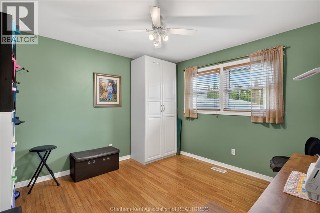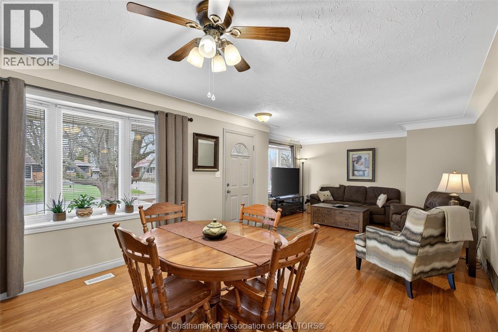 Pride of ownership shows throughout this solid brick bungalow in one of Chatham's most established neighbourhoods — 2 main floor bedrooms, hardwood floors, bright living and dining area, and an updated kitchen with painted cabinetry, centre island, pendant lighting, and mudroom entry with patio doors leading to a rear deck overlooking a beautifully maintained backyard. The main floor 4-piece bath is complemented by a fully finished lower level that genuinely impresses — large rec room with stacked-stone gas fireplace, second living area, 2 additional bedrooms, and a 3-piece bath with glass shower. Four bedrooms total with a layout that suits growing families, multi-generational living, or anyone needing extra space. The oversized attached garage offers serious storage and workspace potential, a separate storage shed adds even more utility, and the wide concrete driveway ties together an outdoor package that's as functional as it is attractive. (id:4555)