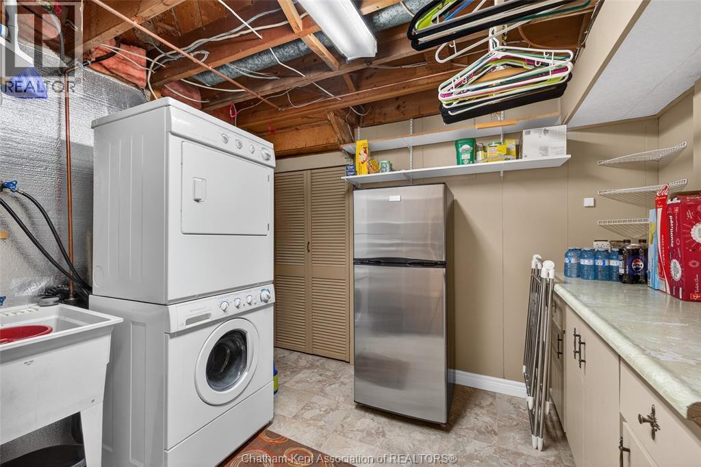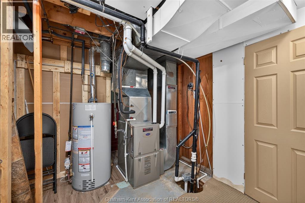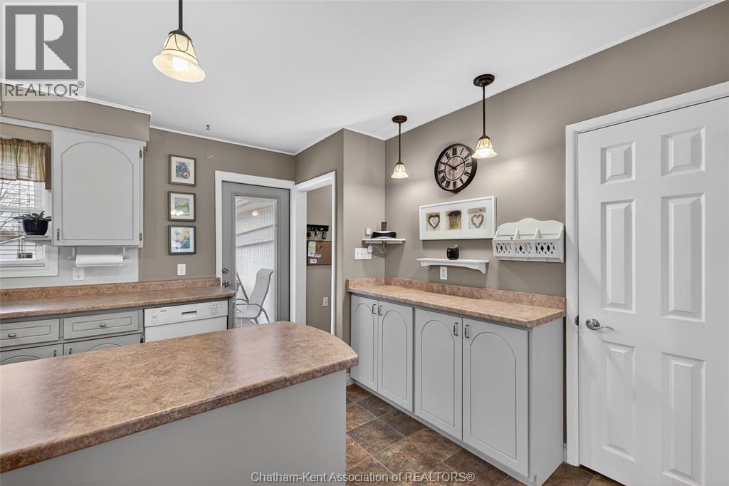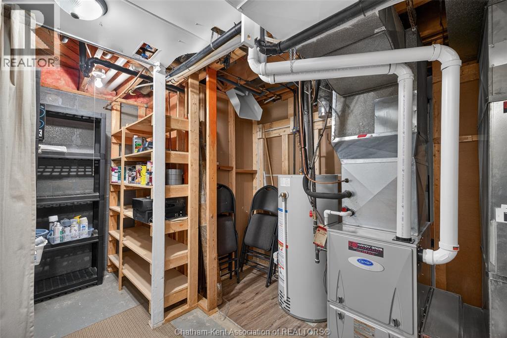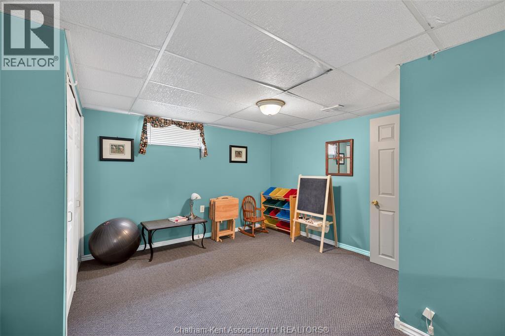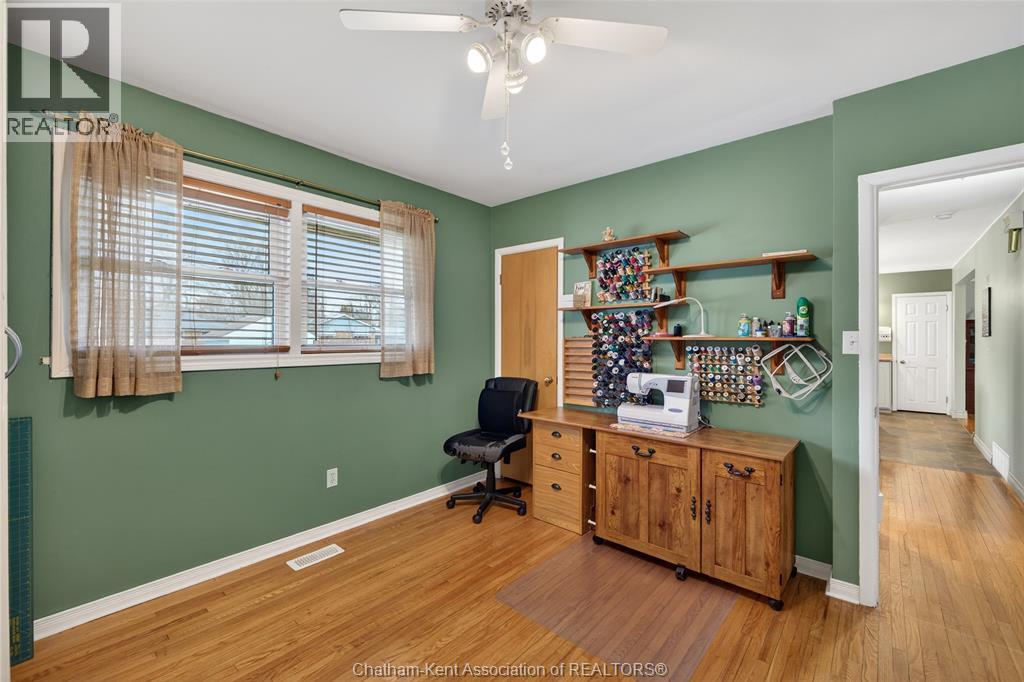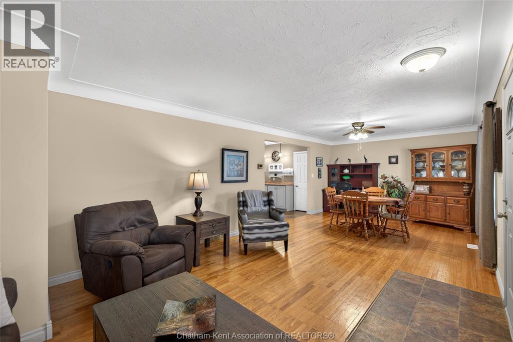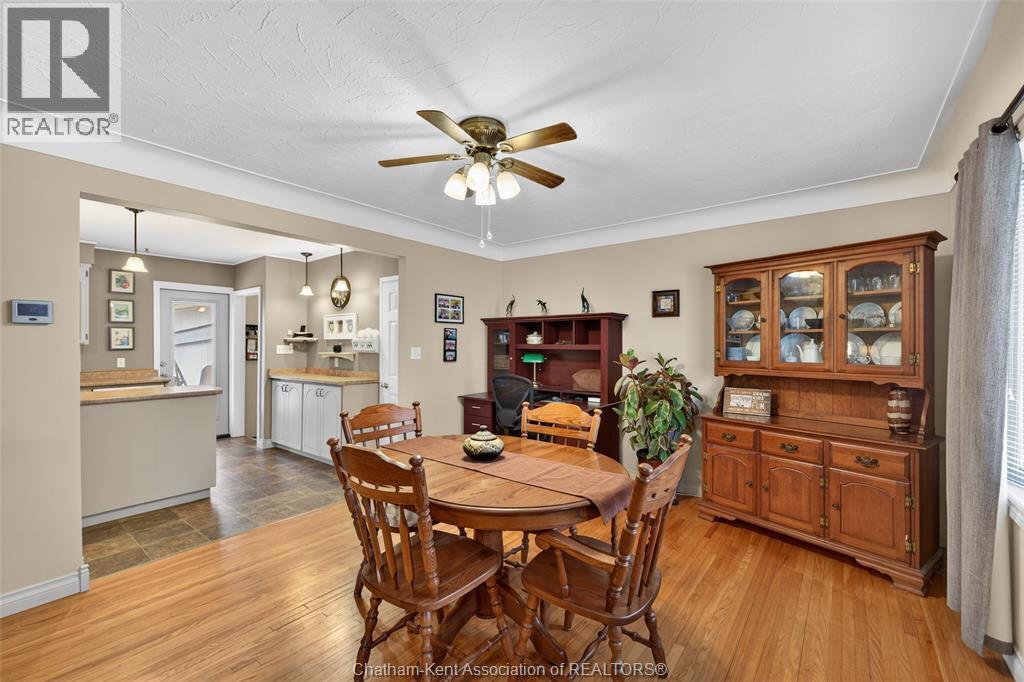 Pride of ownership shows throughout this solid brick bungalow in one of Chatham's most established neighbourhoods — 2 main floor bedrooms, hardwood floors, bright living and dining area, and an updated kitchen with painted cabinetry, centre island, pendant lighting, and mudroom entry with patio doors leading to a rear deck overlooking a beautifully maintained backyard. The main floor 4-piece bath is complemented by a fully finished lower level that genuinely impresses — large rec room with stacked-stone gas fireplace, second living area, 2 additional bedrooms, and a 3-piece bath with glass shower. Four bedrooms total with a layout that suits growing families, multi-generational living, or anyone needing extra space. The oversized attached garage offers serious storage and workspace potential, a separate storage shed adds even more utility, and the wide concrete driveway ties together an outdoor package that's as functional as it is attractive. (id:4555)