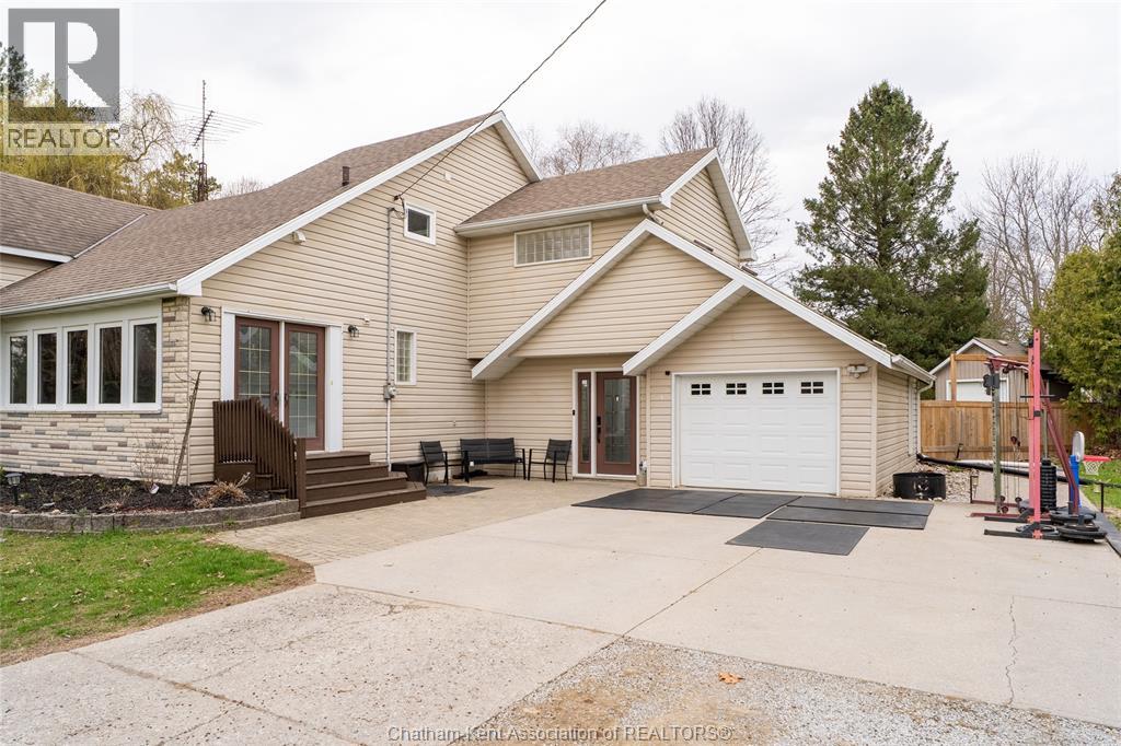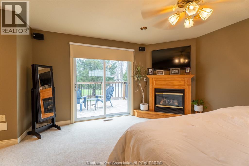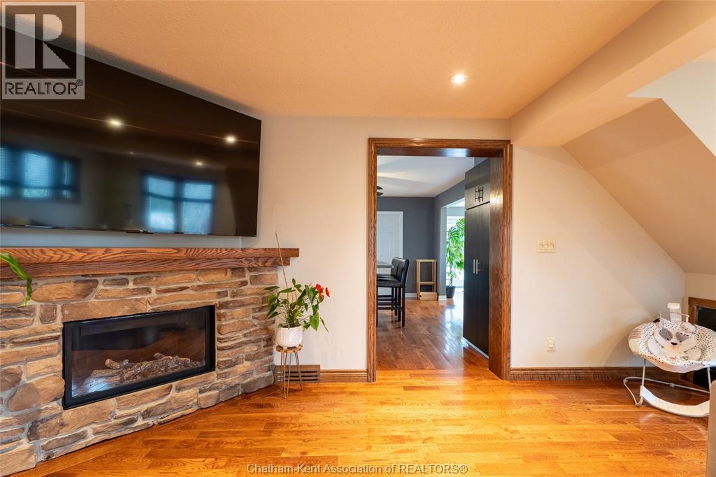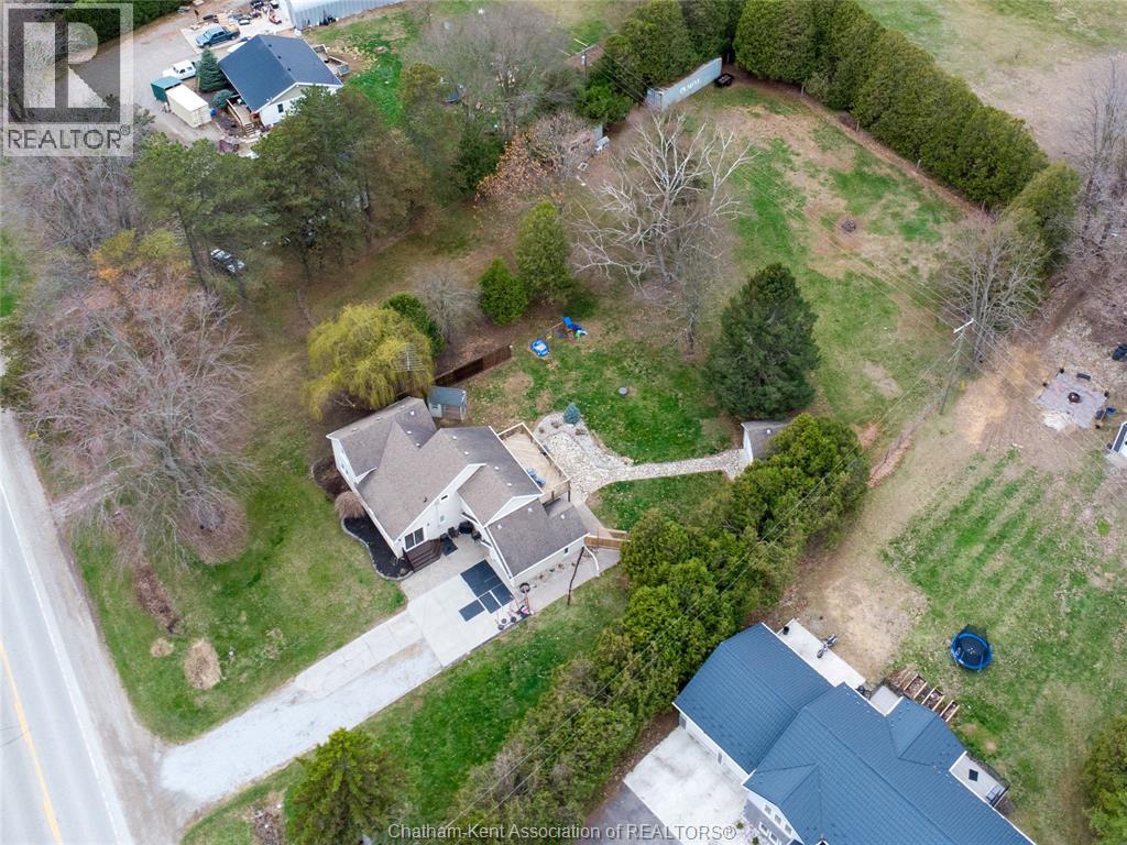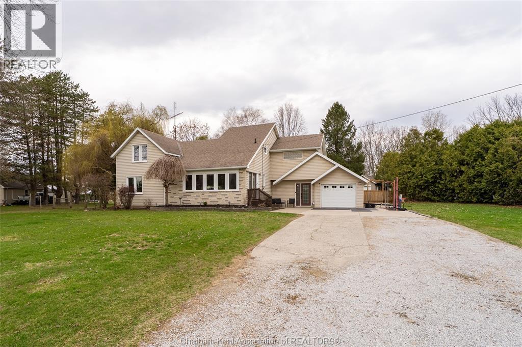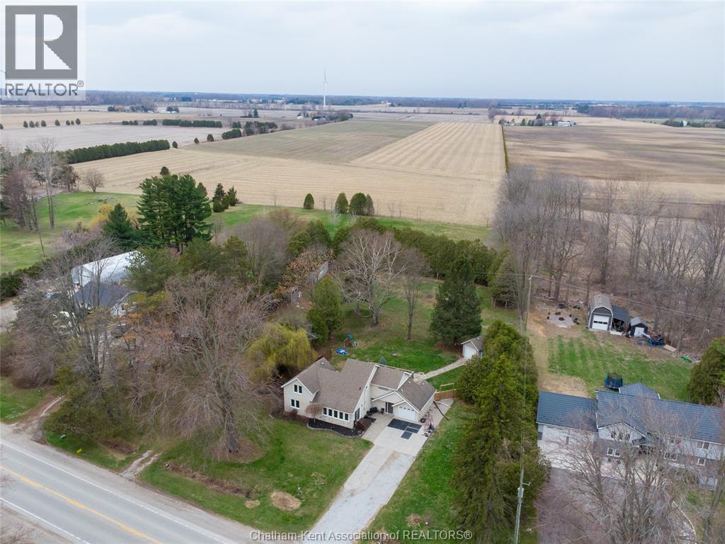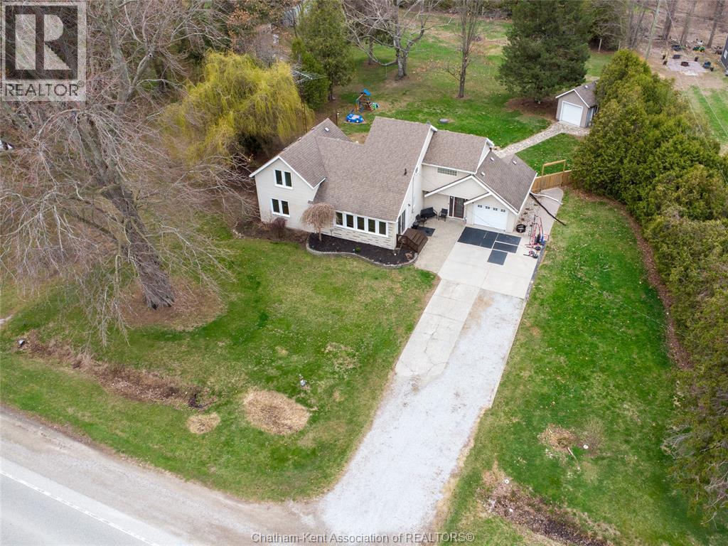 Spacious country living on 1.5 acres just outside of Thamesville, perfectly situated between Thamesville and Chatham on a paved road with natural gas! Set on a very private, tree-lined lot, this property offers both space and seclusion. This well-maintained home features over 2,200 sq ft of living space with 3 bedrooms and 2 full bathrooms, ideal for families looking for room to grow. The main floor showcases hardwood flooring throughout, a large open-concept kitchen and dining area perfect for entertaining, and a welcoming living room with a cozy gas fireplace. Patio doors lead out to a covered patio, creating a great space to relax and enjoy the peaceful surroundings. Upstairs, you’ll find three generously sized bedrooms, including an impressive primary suite featuring its own gas fireplace, his and hers closets, and access to a private balcony overlooking the entire property. The additional bedrooms are all spacious and functional. The home also offers a heated attached garage with natural gas, along with a detached garage at the rear of the property—ideal for extra storage, hobbies, or workspace. Updates include a natural gas furnace and central air (2020), eavestroughs with gutter guards (2020), and asphalt shingles (2015). The basement includes a sump pump and provides plenty of storage space. The property is serviced by clean, potable well water. A fantastic opportunity to enjoy private country living with modern comforts, all within a convenient distance to nearby towns and amenities. (id:4555)